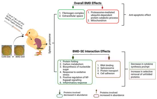 Summary of results of the effects of BMD treatments on the spleen proteome in chicks. The summary image was generated using BioRender (Toronto, ON, Canada) www.biorender.com, accessed on 2 April 2024.