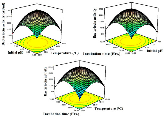 Response surface plots showing interactive effects between independent variables (temperature, pH and incubation time) for improved bacteriocin production by Lactobacillus plantarum.