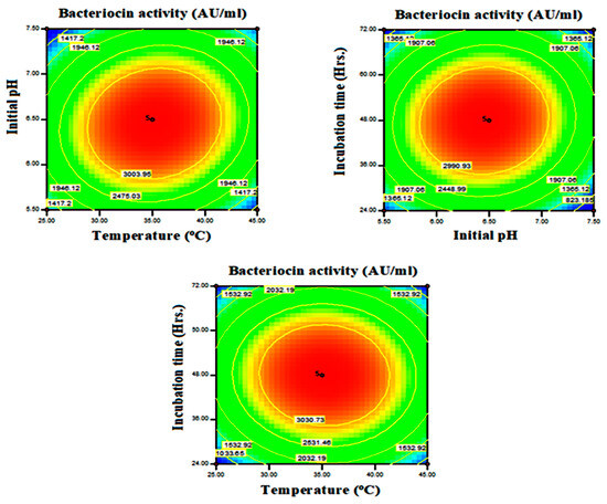 Salman et al. [53] reported on the bacteriocin production by Lactobacillus acidophilus MS1 under the optimized process conditions they recognized through a BBD. The findings they obtained were like those of the present study, with their greatest quantity of bacteriocin (2600 AU/mL) being observed at 30 °C, pH 6, and incubation time of 18 h. Even in the aforementioned study, the production medium pH of the regression model was found to significantly influence the bacteriocin production. These findings corroborate our experimental results.