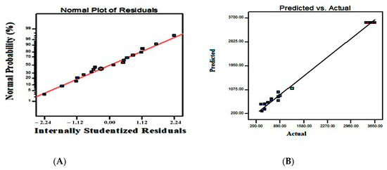 To estimate the dispersion of empirical error terms, a homogeneity percentile plot was employed. The parameters measured followed a near-perfect linear distribution, indicating the model’s relevance and correctness. The normality assumption of empirical residues was shown by a horizontal line in this graph, confirming the model’s validity (Figure 3). Measurements were taken in five independent repetitions, with the appropriate optimum settings for evaluating the results and establishing the accuracy of the predictions made: With 48 h of incubation under steady circumstances, at a pH of the medium of 6.5, and a temperature of 350 °C. The experimental results (3650 AU/mL) agreed with the anticipated values (3530 AU/mL), demonstrating the appropriateness of the model.