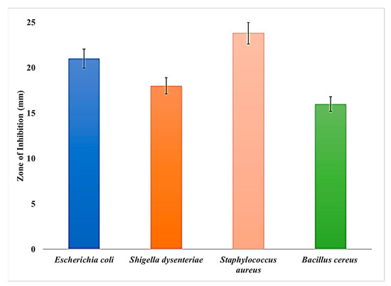 The antibacterial effects of the crude bacteriocin produced were tested against four different bacterial species: E. coli, Shigella dysenteriae, S. aureus, and B. cereus, and results are represented in Figure 4. The maximum inhibition zone of 23.80 ± 1.33 (mean ± S.D.) was obtained against S. aureus, followed by E. coli (21.00 ± 0.63). The inhibitory effect of bacteriocin was demonstrated with the zone of inhibition obtained in the experiment. The one-way ANOVA test revealed that inhibitory zones demonstrated against the bacterial pathogens are statistically significant based on F value (F = 49.76; p < 0.001). A post hoc analysis for the bacteriocin inhibitory effect against bacterial pathogens was accomplished using a DMR test, in addition to the ANOVA, and this showed a greater difference between the bacterial strains of the different species (Figure 4).