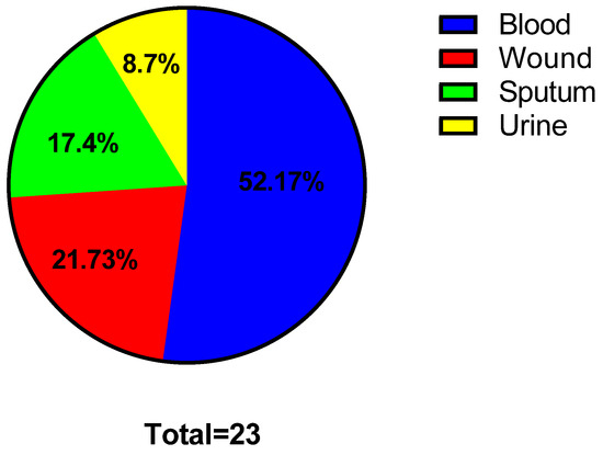 The clinical specimens from which the bacterial isolates were recovered include blood, wounds, sputum, and urine (Figure 1). The antibiotic susceptibility of the tested isolates is revealed in Figure 2.