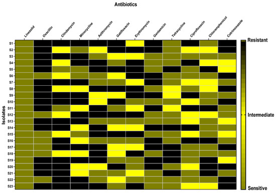 Heat map representing the susceptibility of S. aureus isolates to different antibiotics.