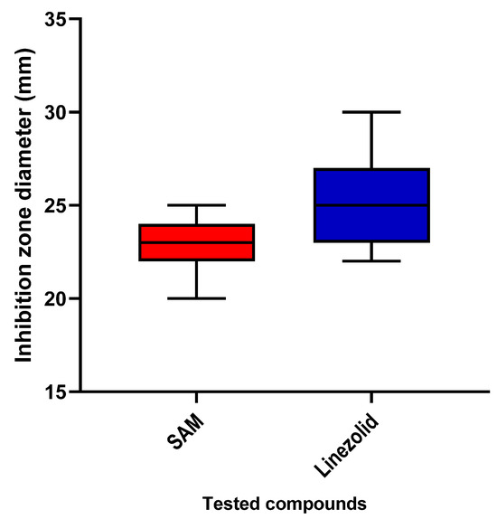 Antibacterial action was revealed by agar well diffusion in MHA plates [71]. The bacterial suspension (0.5 McFarland) was dispersed on the surface of the MHA plates. Three wells were performed. The first well-received CDE (2 mg/mL), the second received linezolid (positive control), and the third received dimethyl sulfoxide (DMSO, negative control). The appearance of inhibition zones revealed CDE’s antibacterial activity after incubating the plates at 37 °C for 24 h [72].