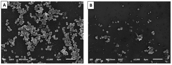 SEM micrograph revealing the morphology of S. aureus biofilm formed on the surfaces of cover glass: (A) without (untreated isolates) and (B) with CDE (treated isolates).