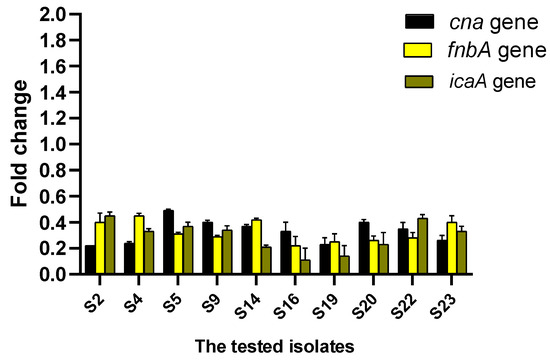 The influence of CDE on the expression levels of the biofilm genes (cna, fnbA, and icaA) was elucidated using qRT-PCR. After growing the isolates in TSB in the presence and absence of sub-MICs of SAM, they were incubated overnight at 37 °C. After the incubation period, cells were harvested by centrifugation and immediately stored at −80 °C. The total RNA from S. aureus isolates was extracted and purified using TRIzol® reagent (Life Technologies, Carlsbad, CA, USA) following the manufacturer protocol. Reverse transcription was employed using the QuantiTect Reverse Transcription kit (Qiagen, Hilden, Germany). Then, the formed cDNA was amplified using Maximas SYBR Green/Fluorescein qPCR master mix (Thermo Fisher Scientific, Waltham, MA, USA). The average threshold cycle (CT) values were normalized to the housekeeping gene (16s rRNA). The relative gene expression of the treated isolates was compared to that of the untreated ones according to the 2−∆∆Ct method [76]. Primers are exposed in Table S1 [77,78].