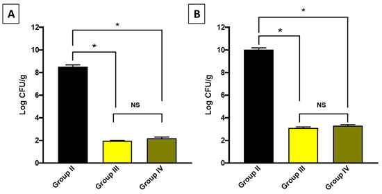 Bacterial burden in (A) the liver and (B) the spleen. The symbol (*) denotes a significant difference (p < 0.05). The abbreviation (NS) denotes a non-significant difference (p > 0.05).