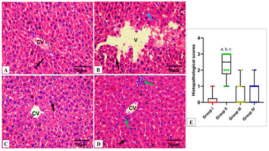 Light microscopic H&E-stained images of hepatic sections of adult albino rats of all studied groups. (A) Group I shows normal hepatic architecture in the form of hepatic cords (c) radiating from the central vein (CV) and separated by the hepatic sinusoids (S), with pericentral zone and midzone hepatocytes. Polyhedral hepatocytes appear with rounded vesicular nuclei and granular eosinophilic cytoplasm (black arrow) separated by sinusoids (S) lined with endothelial cells and Kupffer cells. (B) Group II shows disturbed hepatic architecture, compressed hepatic sinusoids, multiple pyknotic nuclei (black arrow), multiple karyolitic nuclei (blue arrow), and diffuse vacuolar degeneration of hepatocytes with multiple large vacuoles (V) as well as ballooned hepatocytes. (C) Group III shows organized hepatic cords (C) around the central vein, resembling the normal hepatic structure of Group I. (D) Group IV shows marked improvement and a regaining of the normal hepatic structure. However, with this enhancement, inflammatory cells infiltrate the pericentral zone (green arrow). (E) Histopathological score of the hepatic tissue cross sections in all studied groups. A box plot was used to express the data. The bottom of the plot represents 25%, the middle represents the median, and the top represents 75% of the data. Significant difference at p ≤ 0.05, where (a) in comparison with group I, (b) in comparison with group III, and (c) in comparison with group IV using the Kruskal–Wallis test followed by Dunn’s pairwise comparison post-hoc test. (H&E × 400, scale bar = 50 μm).