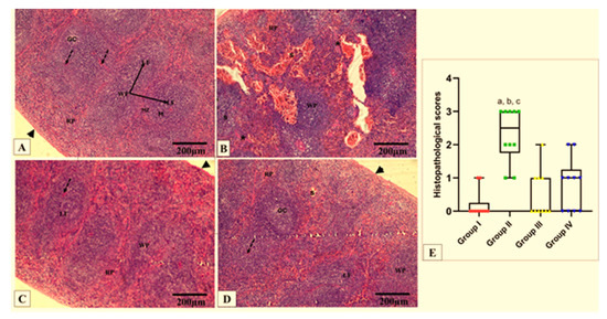 Photomicrographs of H&E-stained sections of spleen in all studied groups. (A) Group I shows the normal histological organization of white pulp (WP) and red pulp (RP) surrounded by a capsule (arrowhead). The WP presents the central arteriole (dashed arrow) and lymphoid follicles (LF), with germinal centers (GC) and mantle regions (M), surrounded by a loosely distributed marginal zone (MZ). The RP presents lymphocytes, trabeculae, and sinusoids. (B) Group II shows a loss of normal architecture, shrunken WP, and broadened RP. Note congested, dilated splenic sinuses (S) in the RP. Many cells in the WP appear vacuolated. Thick fibrous trabeculae are observed (asterisk). (C) Group III shows a nearly normal appearance of the WP and RP splenic architecture. (D) Group IV shows a nearly normal outline of splenic architecture, but congested splenic sinuses are also seen. (E) Histopathological score of the splenic tissue cross sections in all studied groups. A box plot was used to express the data. The bottom of the plot represents 25%, the middle represents the median, and the top represents 75% of the data. Significant difference at p ≤ 0.05 (a) in comparison with group I, (b) in comparison with group III, and (c) in comparison with group IV using the Kruskal–Wallis test followed by Dunn’s pairwise comparison post-hoc test. (H&E × 100, scale bar = 200 μm).