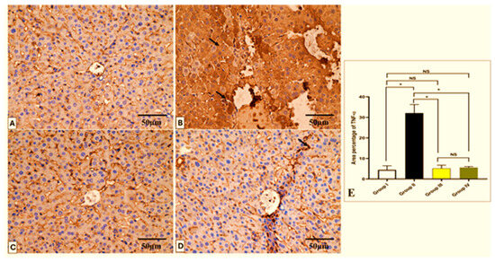 Light microscopic TNF-α-stained pictures of a liver section in all studied groups. (A) Group I shows a negative TNF-α expression within the hepatocytes’ cytoplasm. (B) Group II shows a strong positive expression of TNF-α, which appears as brownish cytoplasm in hepatocytes (arrows). (C) Group III shows a negative expression of TNF-α. (D) Group IV shows a mild positive expression of TNF-α in a few hepatocytes (arrow) and a negative expression in most of the cells. (E) The area percentage of TNF-α in each group. Mean ± SD was used to represent the data. One-way ANOVA was used for the statistical comparison, and Tukey’s post-hoc test was used for multiple comparisons. The single asterisk indicates a significant change, and the abbreviation NS denotes a non-significant change (p < 0.05). (TNF-α × 400, scale bar = 50 μm).