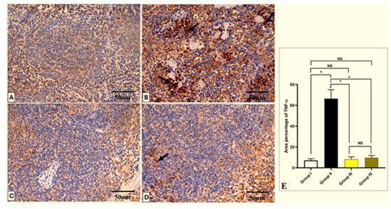 Six-micrometer tissue sections from the liver and spleen were subjected to immunohistochemical staining; they were first dewaxed, rehydrated by a diminishing alcohol series, and treated with 10% hydrogen peroxide in methanol for ten minutes. Following this, the sections were microwaved for ten minutes in 0.01 M sodium citrate buffer (pH 6.0), allowed to cool at room temperature, and then repeatedly washed with PBS for five minutes. After washing, antigens were recovered by autoclaving in citrate buffer for 11 min. Next, slices were incubated with primary antibodies for a whole night at 4 °C. Then, the tissues were treated for 30 min at room temperature with 3, 3-diaminobenzidine and a rabbit polyclonal TNF-α antibody. The tissue sections were mounted for visibility, washed in xylene, and subtly counterstained with hematoxylin. Slides were examined under a light microscope at a magnification of ×400 [83]. Using image analysis tools (Image J, 1.46a, NIH, Bethesda, MD, USA), morphometric analysis was carried out. At ×400 magnification, the mean area percentage of TNF-α protein expression for each of the experimental groups was evaluated in ten non-overlapping fields within each region.