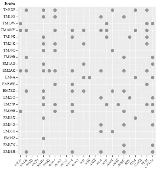 - Gundran, R.S.; Cardenio, P.A.; Villanueva, M.A.; Sison, F.B.; Benigno, C.C.; Kreausukon, K.; Pichpol, D.; Punyapornwithaya, V. Prevalence and distribution of blaTX-M, blaSHV, blaTEM genes in extended-spectrum β-lactamase-producing E. coli isolates from broiler farms in the Philippines. BMC Vet. Res. 2019, 15, 227. [Google Scholar] [CrossRef]