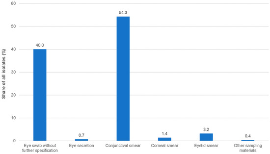 A total of 1366 isolates were collected. This number was slightly higher than in the three previous studies (Table S1). More than two thirds of the isolates were obtained from outpatients and approximately 20% from inpatients, while, for the remaining isolates, the status of the respective patients was unknown or not documented. The most common sampling material for isolation was conjunctival swabs, followed by eye swabs without further specification (Figure 1; Table S1).