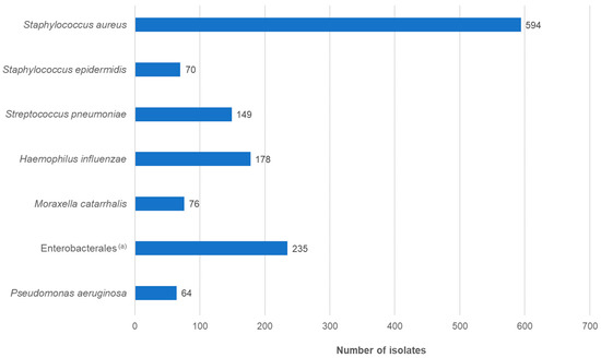 The gender ratio of the patients was approximately equal. The majority of patients belonged to the ≤1 year age group, followed by 60- to 79-year-olds. Overall, just over half of the patients were younger than 10 years, with a median age of 3 years. This distribution was in accordance with previous studies. The type of infection was documented in 43.3% of cases. Of the 774 patients, approximately 84% had conjunctivitis or keratoconjunctivitis (Table S1). The most frequently isolated pathogenic species was S. aureus, followed by H. influenzae and S. pneumoniae (Figure 2; Table S1).