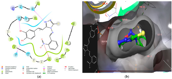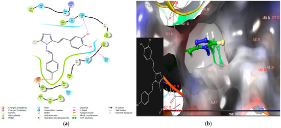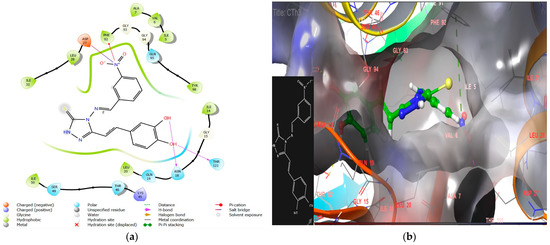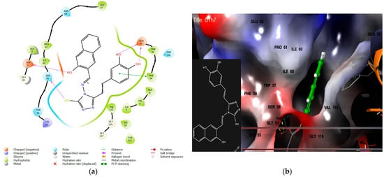Another ligand, CTh4, exhibited remarkable interactions within the target protein, forming hydrogen bonds with key residues Asp27, Asn18, and Thr121, as shown in Figure 6. The phenolic group of the ligand and the triazole moiety are embedded in a hydrophobic cavity, leading to excellent docking scores and binding energies (−9.3, −72.84 kcal/mol).