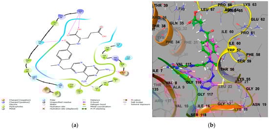 (a) Depicts a 2D interaction perspective of methotrexate with PDB ID 1U72. (b) Superimposed image of CTh7 (magenta) and MTX (green) in the binding pocket of the DHFR (1U72) receptor with amino acid residues present in proximity of the active site.