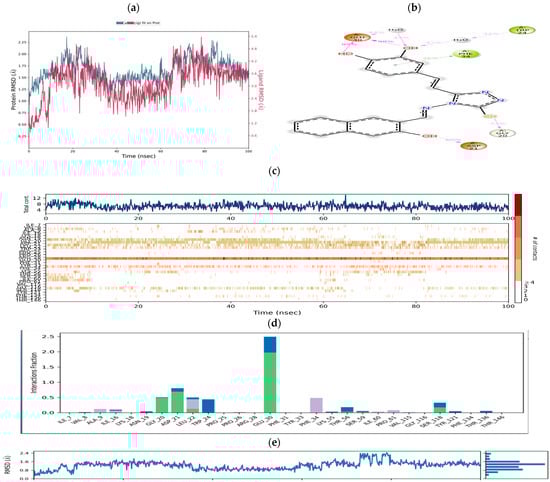 (a) RMSD relative to the initially minimized complex of the molecule during MD simulations {protein (PDB ID 1U72): left Y-axis and ligand CTh7: right Y-axis}. (b) A schematic of detailed ligand CTh7 atom interactions with the protein residues (interactions that occur more than 30.0% of the simulation time in the selected trajectory). (c) A timeline representation of the interactions and contacts between protein and ligand CTh7. (d) Protein interaction with ligand (green: hydrogen bond; purple: hydrophobic; blue: water bridges). (e) Root mean square deviation of a ligand with respect to the reference conformation.