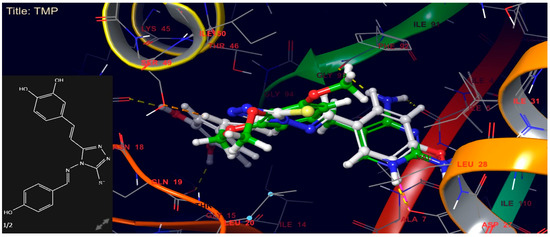 Hydrophobic interactions were also seen between the ligand and hydrophobic amino acid residues, securely holding the compound CTh4 within the compact substrate cavity (superimposed image of CTh4 and TMPs shown in Figure 7).