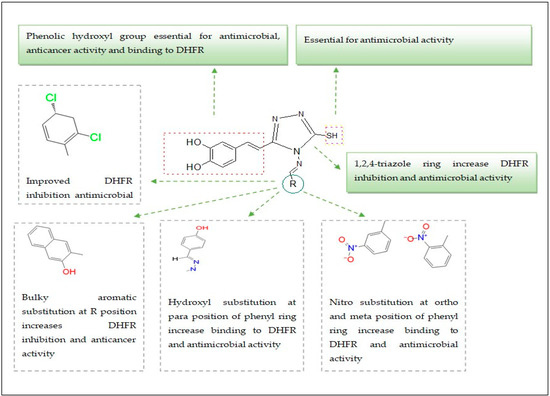 Upon analyzing the biological activities, it can be concluded that the occurrence of a phenolic hydroxyl group in caffeic acid is essential for DHFR inhibitory activity. Additionally, introducing a triazole ring on the carboxylic functional group of the acid further enhances antimicrobial and anticancer activity. The Schiff base formation with the triazole ring significantly improves biological activity. Substituting electronegative groups like nitro, hydroxyl, and chloro groups enhances antimicrobial activity remarkably. The incorporation of bulky groups in Schiff bases may increase the DHFR inhibition and anticancer potential against the MCF-7 tumor cell line, possibly due to the increased lipophilic character of the compound. Overall, these findings suggest that specific substitutions and modifications can significantly impact the biological activities of the compounds under study, as summarized in Figure 9.