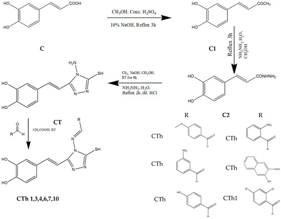 The in silico screening revealed that the introduction of a 1,2,4-triazole ring to caffeic acid could enhance the interaction between the derivatives and the DHFR receptor. To further improve the interaction and activity, hundreds of Schiff bases of 4-[2-(4-amino-5-mercapto-4H-triazol-3-yl)vinyl]benzene-1,2-diol were designed. These derivatives were synthesized following a multistep process outlined in Scheme 1 [45].