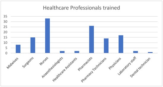 The training was delivered to 120 healthcare professionals in the two sites by three trained trainers. In total, 60 (50%) were male and 60 (50%) were female, with 10 different healthcare professions represented at the trainings (Figure 1).