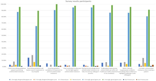 The pre-training questionnaire was completed by 107 participants and the post-training one by 72 participants. The survey results showed improvement post-training in all AMR- and AMS-related questions. All participants agreed or strongly agreed with the statement ‘Ensuring guideline compliance is important to prevent antimicrobial resistance’. Furthermore, the statement ‘I feel motivated to advocate for the fight against antimicrobial resistance’ was supported, with 97.4% of participants agreeing or strongly agreeing, as displayed in Figure 2.