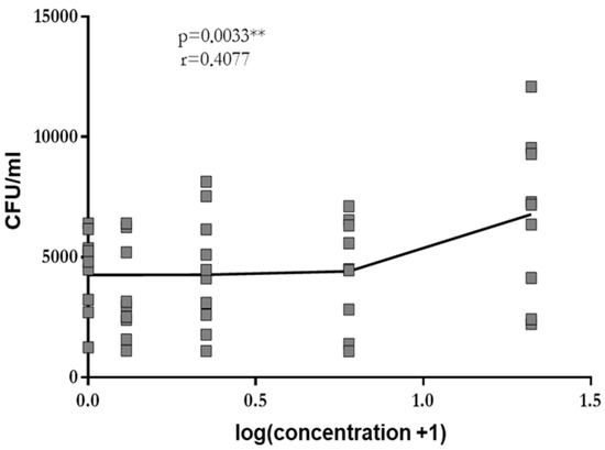 Phagocytosis of E. coli by leukocytes in whole blood drawn from young volunteers after 2 h of pre-incubation with 0.0 mg/mL, 0.3 mg/mL, 1.25 mg/mL, 5 mg/mL and 20 mg/mL of GA. Each point represents the median of 3 measurements. The dose–response relation was established by log-linear regression, and the calculation of the Pearson’s correlation coefficient was performed. ** p < 0.01.