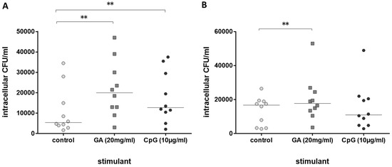 Phagocytosis of E. coli by leukocytes in whole blood after 2 h of pre-incubation with 20 mg/mL of GA, 0.9% NaCl as negative and 10 µg/mL of CpG as positive control ((A): n = 10, young healthy volunteers, 20–35 years; (B): n = 10, older healthy volunteers ≥80 years). Each point represents the median of 3 measurements, the horizontal bars represent the medians of 10 individuals; ** p ≤ 0.01, Friedman test followed by Wilcoxon matched-pairs signed-rank test with Bonferroni–Holm correction for repeated testing.