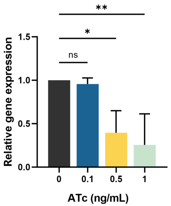 Figure 2. mmpL3 gene expression in the mmpL3_KD M. smegmatis strain in the presence and absence of ATc (ng/mL). The experiments were conducted in biological and technical triplicates. Statistical significance is indicated as * p < 0.05 and ** p < 0.01, and “ns” indicates not statistically significant. The error bars represent the SDs of the means.