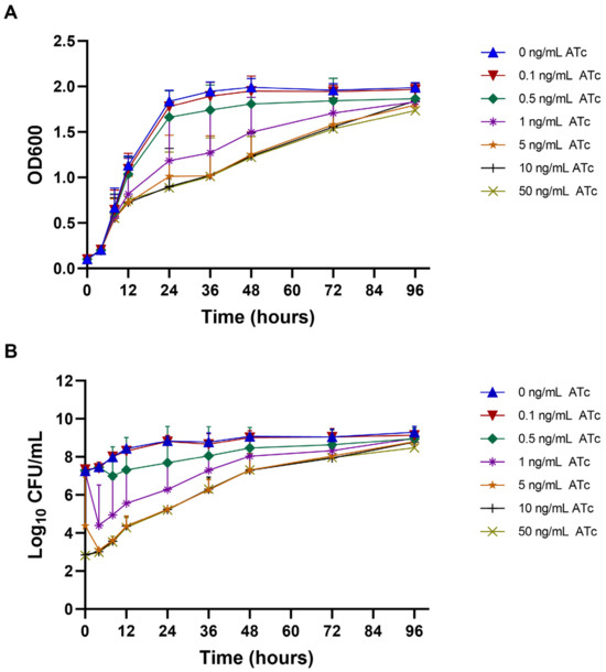 Figure 3. Growth curve and viability of the mmpL3_KD M. smegmatis strain at different time points. (A) OD600 of the mmpL3_KD M. smegmatis strain at different ATc concentrations (ng/mL). (B) The viability (log10 CFU/mL) of the mmpL3_KD M. smegmatis strain at different ATc concentrations (ng/mL). The experiments were conducted in biological and technical triplicates. The error bars represent the SDs of the means.