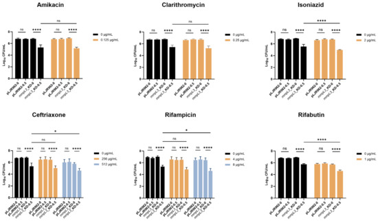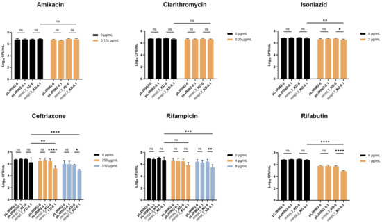 Figure 4. Repression of mmpL3 with 0.1 ng/mL ATc resulted in resensitization to isoniazid, ceftriaxone, rifampicin, and rifabutin. The viability (log10 CFU/mL) of the mmpL3_KD and pLJR962 control M. smegmatis strains treated with antimicrobial agents in the presence or absence of 0.1 ng/mL ATc was determined in biological and technical triplicates. Statistical significance is indicated as * p < 0.05, ** p < 0.01, *** p < 0.001, and **** p < 0.0001, and “ns” indicates not statistically significant. The error bars represent the SDs of the means.