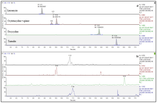 Extracted ion chromatograms: (a) soil after two days of spreading (t2); (b) soil before slurry spreading (t0). The peaks of the four most abundant antibiotics (lincomycin, oxytetracycline, doxycycline, and tiamulin) are shown.