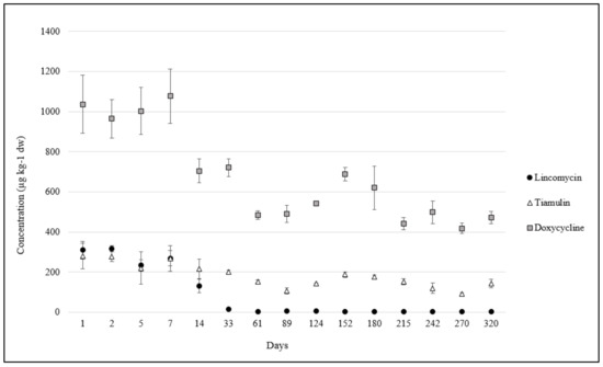 Soil concentrations (µg kg−1 dw) of doxycycline (DOX), tiamulin (TIA), and lincomycin (LIN) during the incubation experiment.