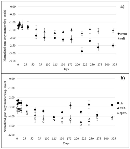 Before slurry application (t0), the relative abundances of ARGs in soil were below the method detection limit (about −5.3 log). Differently, in two similar experiments recently carried out in Flanders (Belgium), Van den Meersche et al. [9] and Huygens et al. [26] observed that the relative concentrations of nine ARGs (tetB, tetL, tetM, tetO, tetQ, tetW, ermB, ermF, sul2) were almost all measurable in soil already before fertilization [9,26]. In the same papers, the detection of various antibiotic residues already before the start of fertilization experiments was reported, too.