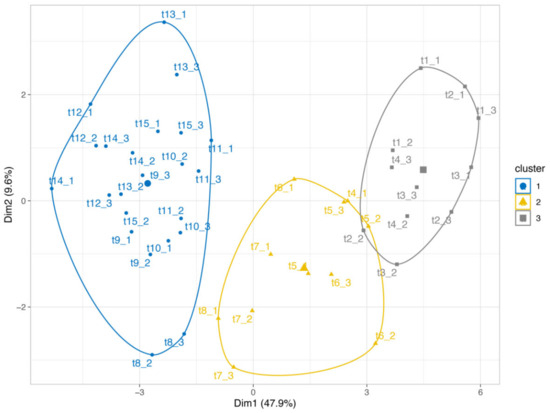 Principal Component Analysis Factor Map: Cluster 1 (●) grouped the observations relative to t9–t15 time points, Cluster 2 (▲) the observations relative to t5–t8 time points, and Cluster 3 (■) the observations relative to t1–t4 time points. Before the underscore is reported, the time point number (t1, t2, t3 … t15) and, after, the number of replicates (1, 2, 3).