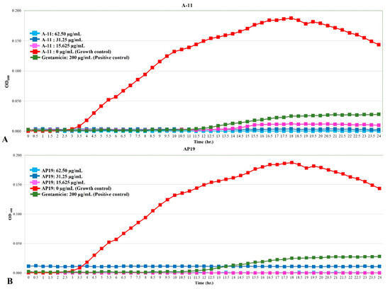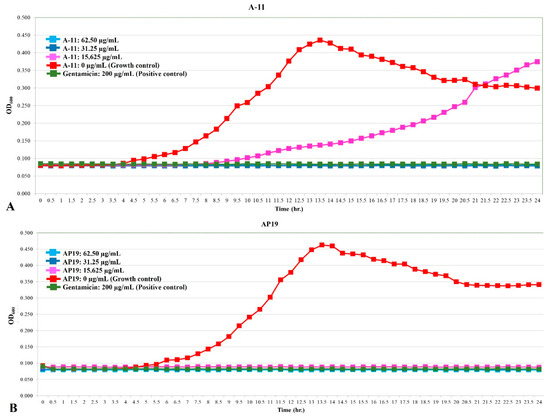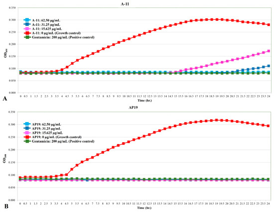 The growth curve of E. coli incubated with different concentrations of A-11 (A) and AP19 (B).