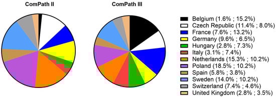 Of the collected isolates during the ComPath II programmes (2013–2014), 1.8% originated from Belgium, 11.4% from the Czech Republic, 7.6% from France, 9.6% from Germany, 2.8% from Hungary, 3.1% from Italy, 15.3% from Netherlands, 18.5% from Poland, 5.8% from Spain, 14.0% from Sweden, 7.4% from Switzerland, and 2.8% from the UK. For the ComPath III programmes (2017–2018), the percentages were 15.2% (B), 8.0% (CZ), 13.2% (F), 6.5% (D), 7.3% (H), 7.4% (I), 10.2% (NL), 10.2% (P), 3.8% (E), 10.2% (SW), 4.6% (CH), and 3.5% (UK). The relative proportion of isolates from each country in the two collection programmes has been summarized in Figure 1.