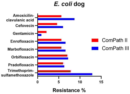Comparison between resistance levels for canine E. coli isolates in ComPath II and ComPath III.