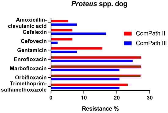 Comparison between resistance levels for canine Proteus spp. isolates in ComPath II and ComPath III.