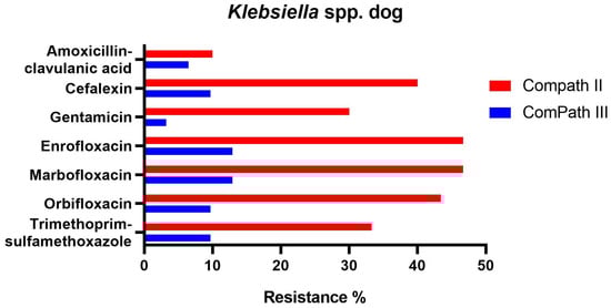 Comparison between resistance levels for canine Klebsiella spp. isolates in ComPath II and ComPath III.