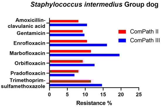 Comparison between resistance levels for canine bacteria from the S. intermedius Group in ComPath II and ComPath III.