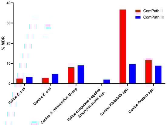 Summary and comparison of MDR across ComPath II and ComPath III for E. coli isolates from cats and dogs, canine S. intermedius Group isolates, feline coagulase-negative Staphylococcus spp., and canine Klebsiella and Proteus spp.