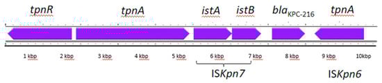 - Naas, T.; Cuzon, G.; Villegas, M.-V.; Lartigue, M.-F.; Quinn, J.P.; Nordmann, P. Genetic Structures at the Origin of Acquisition of the β-Lactamase bla KPC Gene. Antimicrob. Agents Chemother. 2008, 52, 1257–1263. [Google Scholar] [CrossRef] [PubMed]