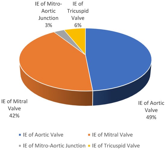 We reviewed 31 original articles describing 31 clinical cases. We observed that the most involved valve was the aortic valve (native and prosthetic), with a total of 16 cases (49%), followed by the mitral valve with a total of 14 cases (42%), the tricuspid valve with 2 cases (6%), and the mitral–aortic junction with 1 case (3%), as summarized in Figure 3. Among all the articles analyzed, four articles documented cases of infective endocarditis on multiple valves, as follows: the mitral valve and aortic valve were both affected and documented in three cases, and the mitral valve and the tricuspid valve were both affected and documented in one case.