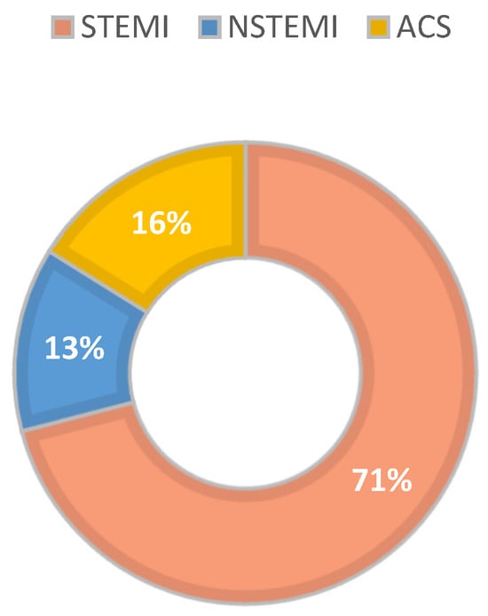 IE complicated by septic embolism in the coronary arteries caused different types of AMI: ST elevation myocardial infarction (STEMI) in the majority of cases, i.e., 22 cases (71%), acute coronary syndrome (ACS) in 5 cases (16%), and NON-ST elevation myocardial infarction (NSTEMI) in 4 cases (13%), as we have illustrated in Figure 4.