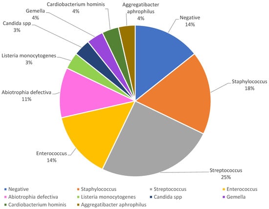 The pathogens were primarily isolated from blood cultures or from the septic embolus culture retrieved from the coronary artery in one case in which the patient had already undergone intravenous antibiotic treatment before their presentation to the hospital. The culture isolates’ results are summarized in Figure 5, as follows: negative blood cultures in four cases (14%), Streptococcus spp. in seven cases (25%), Staphylococcus spp. in five cases (18%), Enterococcus spp. in four cases (14%), Abiotrophia defectiva in three cases (11%), one case with Listeria monocytogenes (3.2%), one case with Candida spp. (3.2%), one case with Gemella (3.2%), and one case each with bacteria classified in the HACEK group—Aggregatibacter aphrophilus (4%) and Cardiobacterium hominis (4%). Out of the ones with negative hemocultures, one case was classified as Libman–Sacks endocarditis.