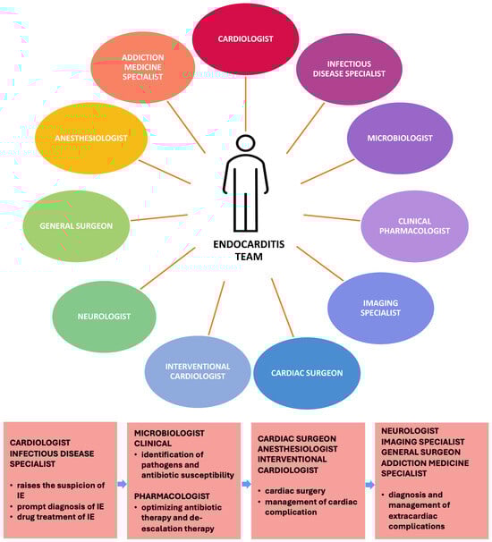 Many aspects of the diagnosis and treatment of infective endocarditis involve complex steps, such as utilizing multiple imaging techniques, selecting the most suitable antimicrobial therapy, managing both cardiac and extra-cardiac complications, and determining when cardiac surgery is necessary. When endocarditis is complicated by acute myocardial infarction, the situation becomes even more sensitive, requiring the involvement of interventional cardiologists. To efficiently address these challenges, collaboration among specialists from different fields is crucial, including cardiologists, infectious disease experts, cardiac surgeons, microbiologists, and imaging specialists (cardiac, nuclear, and neurological) (Figure 6). This multidisciplinary approach, known as the endocarditis team, has proven essential for optimizing patient care and reducing mortality rates. It is recommended that each tertiary center should establish an endocarditis team separate from the standard heart valve team, as described in the 2015 guidelines of the European Society of Cardiology []. Therefore, we consider important to emphasize the significance of the endocarditis team as an example of multidisciplinary collaboration, as it is addressed in this review.