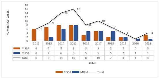 Methicillin-resistant S. aureus (MRSA) and methicillin-susceptible S. aureus (MSSA) infections in SSSS patients from 2012 to 2021.