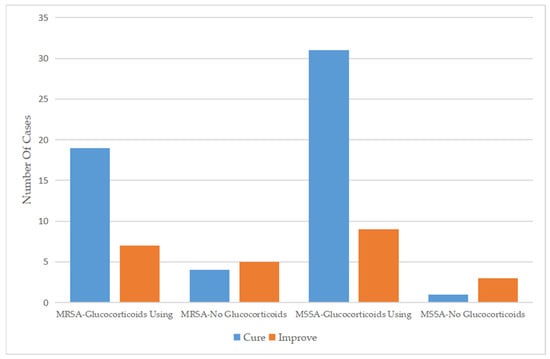 Regarding the therapeutic regimen and treatment course, the duration of antibiotic use for patients infected with MSSA was 6.59 ± 2.81 days, which was similar to the 6.66 ± 2.07 days for patients infected with MRSA. Almost all patients were treated with a cephalosporin, mainly third-generation cephalosporins, as monotherapy. In addition, a small number of patients were treated with cephalosporin combined with other types of antibiotics or other types of antibiotics alone. Approximately 30% of the patients had been treated with antibiotics before admission, while only 14 (17.7%) patients continued to use antibiotics after discharge (Table 2). For patients who used drugs that affect immune function, glucocorticoids were more commonly used in patients infected with MSSA (90.9%) than in those infected with MRSA (74.3%) (Figure 2), while only five patients were treated with gamma globulin (Table 3). Glucocorticoids combined with antibiotics did not significantly affect the length of hospital stay among patients infected with MRSA or MSSA but did significantly improve clinical outcomes.