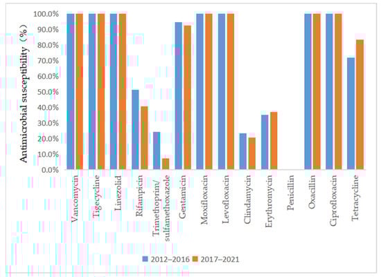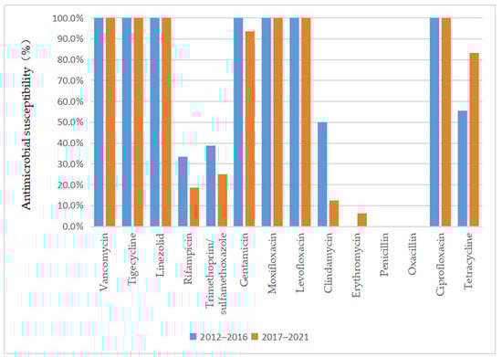 Comparison of the antimicrobial susceptibility of isolates from patients with MRSA infection between 2012–2016 and 2017–2021.